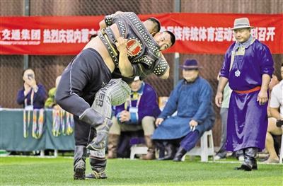 赛场上,身穿传统搏克服的运动员们或攻或守,时而张开双臂寻找战机,时而发起凌厉攻势,拉、扯、推、压间,每个动作都蕴含着智慧与力量。