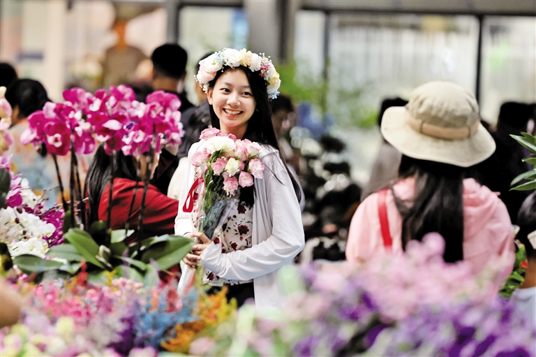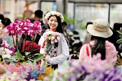 7月28日,游客在云南省昆明市斗南花卉交易市场一家花店内打卡拍照。暑期期间,云南省昆明市斗南花卉交易市场吸引众多国内外游客前来旅游体验,打卡消费。近年来,被誉为“亚洲花都”的昆明市大力发展鲜花经济,花卉产品远销50多个国家和地区。 (据新华社报道)
