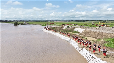 经过两天的连续奋战,截至28日16时,队伍累计完成4500余个沙袋的装填与固定,在堤坝沿线敷设防水布约190米,完成190米堤坝的加固作业,为沿岸群众生命财产安全构筑起一道坚实的“橙色防线”。
