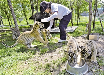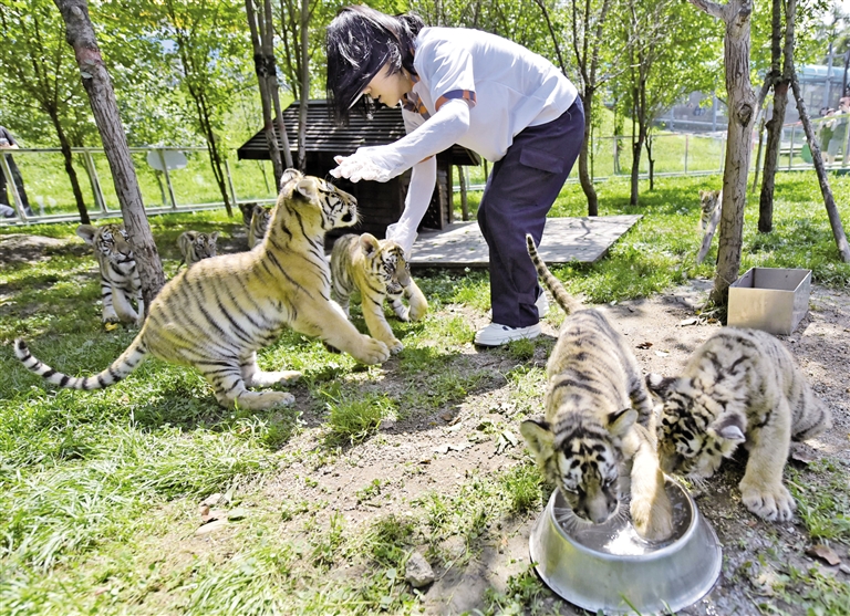 7月28日,横道河子东北虎林园的幼虎在饮水嬉戏。今年3月以来,位于黑龙江省牡丹江市海林市的横道河子东北虎林园陆续有40只东北虎幼崽降生,在工作人员精心照顾下,虎宝宝们茁壮成长,尽显活泼可爱。