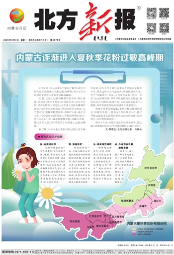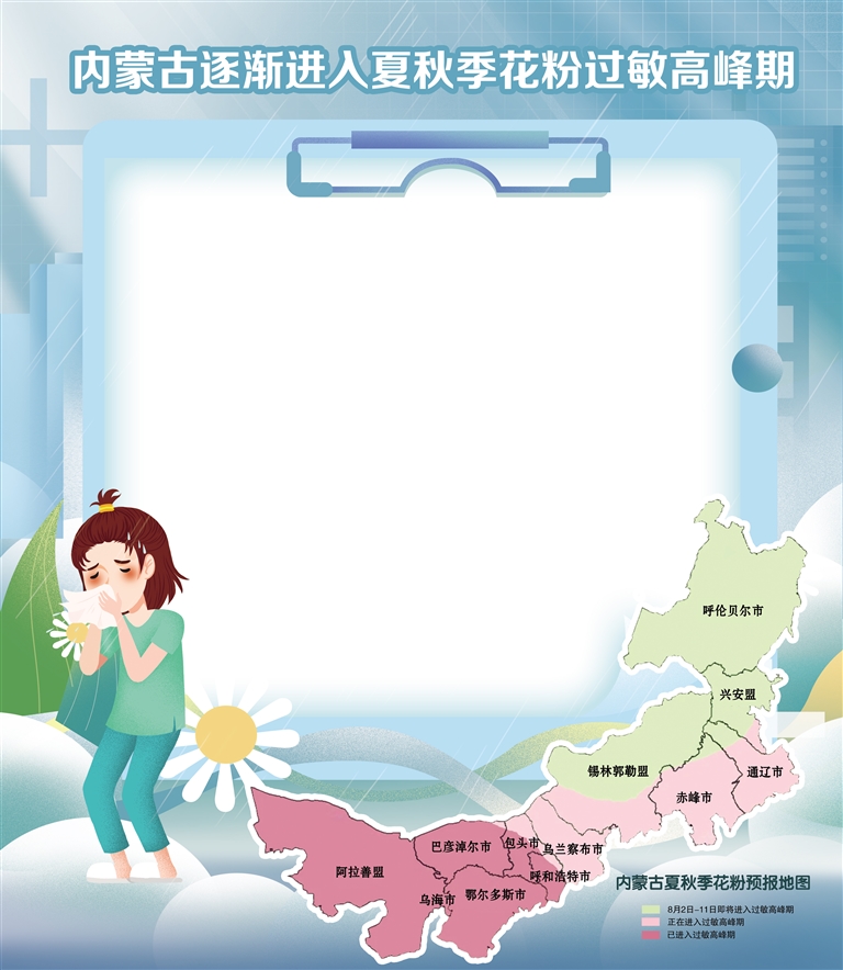 目前,已进入过敏高峰期的盟市有:阿拉善盟、乌海市、鄂尔多斯市、巴彦淖尔市、包头市大部、呼和浩特市大部地区;正在进入过敏高峰期的盟市:包头市东部和北部、呼和浩特市东北部、乌兰察布市、锡林郭勒盟南部、赤峰市大部、通辽市大部、兴安盟南部;即将进入花粉高峰期的盟市:预计8月2~11日,锡林郭勒盟北部、赤峰市北部、通辽市西北部以及呼伦贝尔市将进入过敏高峰期。