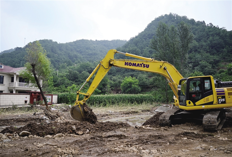 8月2日,在兴隆县六道河镇南台村,工作人员驾驶工程车辆抢修受损的道路。