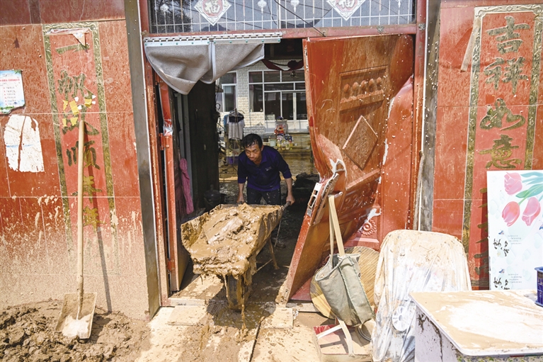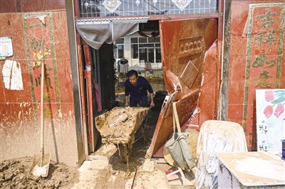 8月1日,在兴隆县六道河镇六道沟村,村民在家中清理淤泥。