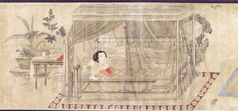 挂在周文矩名下的《倦绣图》实际上是“女子好好午睡图”——里面有竹夫人、懒架、隐囊、羽扇、冰块果盘、画有雪山的床屏和打扇,种植的芭蕉和玉簪更添凉意,待这女子醒来,左有丫鬟端上香茶,右有侍婢奉上果盘,如此消夏,想亦快哉。当然,这只是午睡的初级阶段,古人还有午睡进阶版啊!