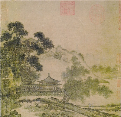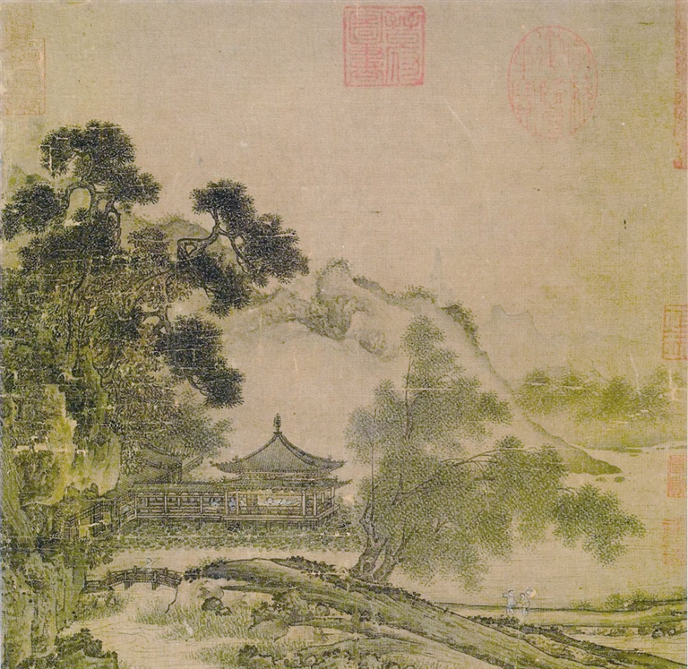 这是一座倚山临水的建筑,有廊屋三间,连接岸边后堂和湖上水堂,水堂甚为宽敞,四角攒尖重檐顶下,依稀可见卧榻画屏,主人沿着廊屋缓步行到水堂,周边荷叶田田、松影摇翠、柳风送凉,这人解衣坦怀,躺得那叫一个平整,还有六个童子正肩着打扇、古琴、茶、果前来,预备等他睡醒后奉上。