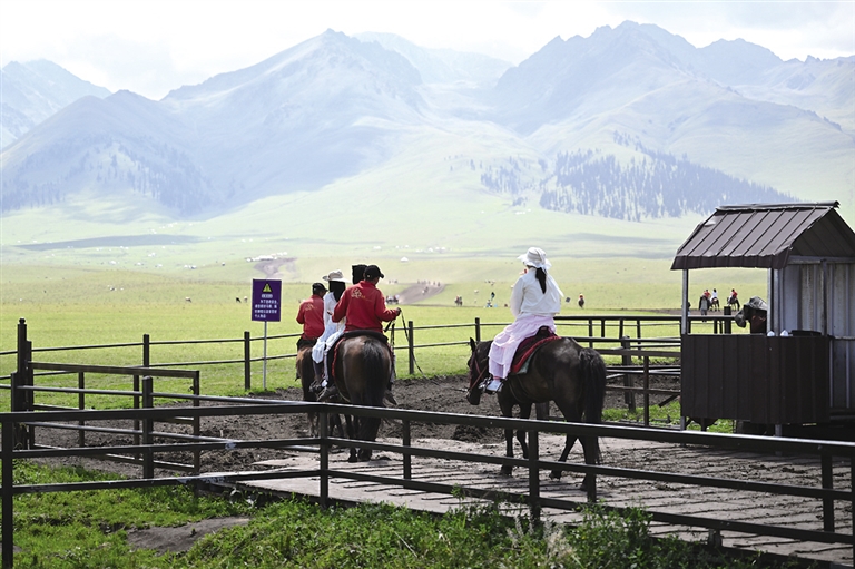 8月3日,游客在那拉提草原骑马游览。