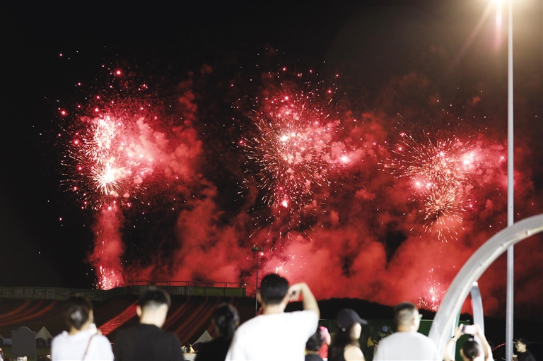 当绚丽的烟花在夜空中绽放,五彩斑斓的光芒照亮了整个天空,现场观众纷纷拿出手机拍照留念。