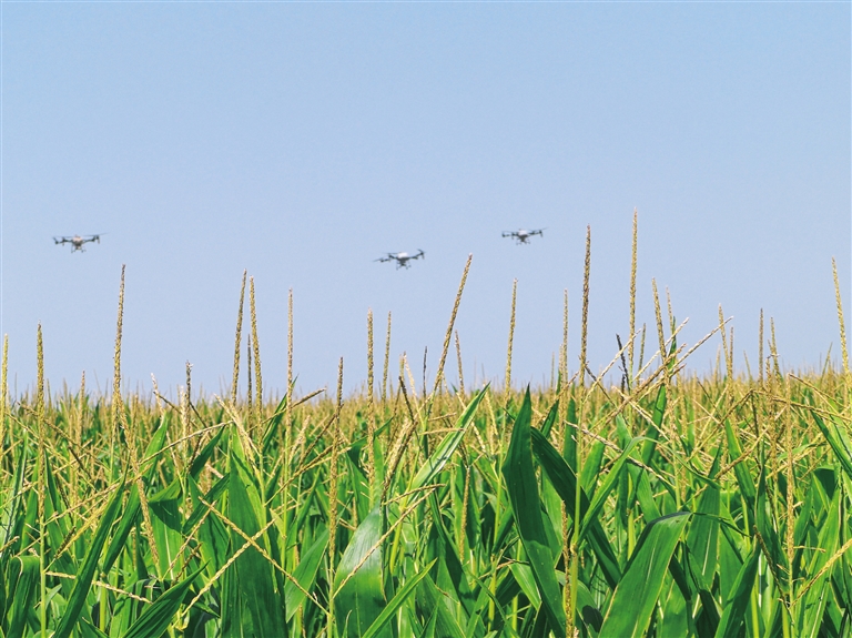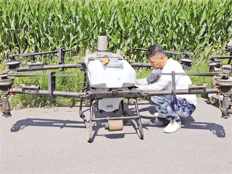 “今年托县计划实施‘一喷多促’项目30万亩,资金来自国家救灾补贴。30台无人机同时作业,预计一周就能完成全部任务!”托克托县农牧推广中心主任任恒介绍,“这‘一喷多促’就像给玉米‘加餐’又‘健身’——在玉米抽穗灌浆的关键期,把微藻营养液等药肥精准喷施下去,一次作业顶得上好几遍人工。既能筑牢病虫害‘防护网’,又能增强抗倒伏能力,还能让玉米粒更饱满,实实在在为丰收添保障。”