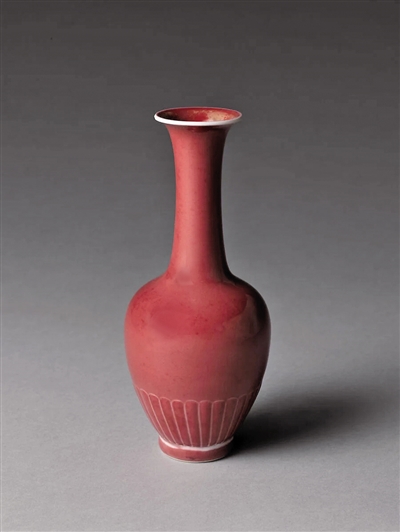 红釉分高温红釉与低温红釉两种。前者以明代永乐、宣德时期的鲜红釉,康熙时期的郎窑红釉,雍正、乾隆时期的祭红釉、豇豆红釉等高温铜红釉为代表。在古代不能精确控制窑温的情况下,其烧造难度极大,然而一旦烧成便可“明如铩赤如血”。祭红又名霁红,是高温铜红釉中的极品。“祭红,其色艳若朱霞,真万代名瓷之首冠也。”明代收藏家项元汴在《历代名瓷图谱》中说。