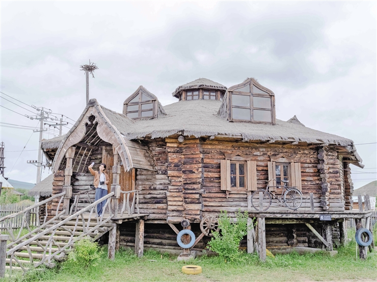 8月21日,在内蒙古恩和俄罗斯族民族乡,游客在当地传统民居木刻楞前拍照留念。位于内蒙古呼伦贝尔市额尔古纳市的恩和俄罗斯族民族乡,是中国唯一一个俄罗斯族民族乡。近年来,当地群众通过开展俄罗斯族家庭游、列巴制作体验、套娃绘画体验等特色活动,吸引大量游客前来观光。2024年,这个仅有2900余人的中俄边陲小镇接待游客61.5万人,实现旅游综合收入9225万元。摄影/新华社记者 马金瑞