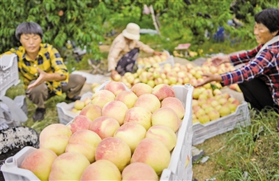 8月23日,果农在新泰市龙廷镇收获桃子。近日,山东省新泰市桃子大面积丰收,当地果农忙着开展桃子收获、运输、存储等工作。新泰市是山东省桃子主产区之一,主要桃子品种有水蜜桃、油桃、黄桃、蟠桃等20余种,全市桃树种植面积约6.6万亩,年产值达8亿元。摄影/新华社记者 徐速绘