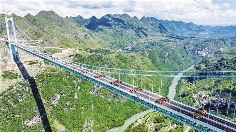 8月25日,在建世界第一高桥——贵州花江峡谷大桥荷载试验顺利完成,通车在即。在静力荷载试验过程中,96辆总重达3300吨的重型大货车分批驶上桥面,对大桥进行了一次全面而严格的“体能测验”。荷载试验顺利完成,标志着大桥通过了“关键大考”,有望于9月下旬宣布通车。花江峡谷大桥于2022年1月开工建设,是贵州六枝至安龙高速公路的控制性工程,全长2890米,主桥跨径1420米,桥面到水面高度625米。花江峡谷大桥建成后,主桥跨径将居山区桥梁跨径世界第一、桥梁高度将居世界第一。 摄影/新华社记者 陶 亮