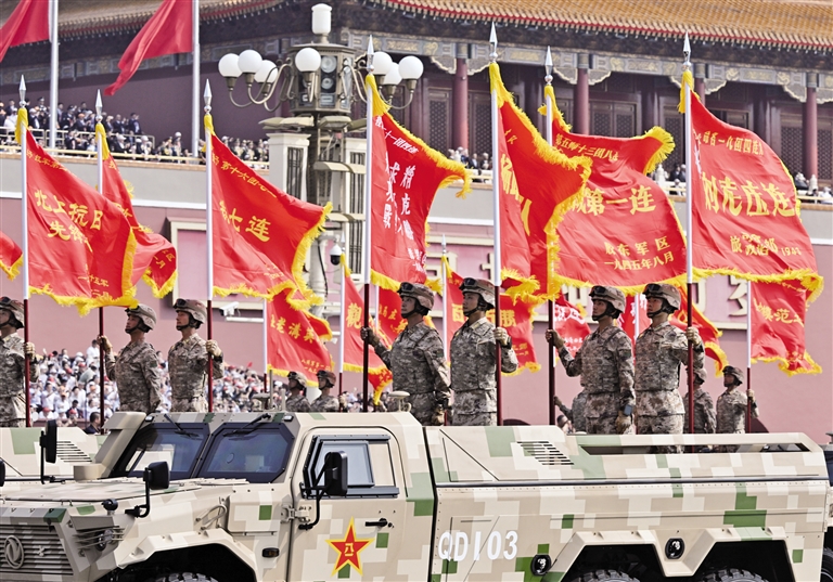 “每一面战旗都扛过枪林弹雨,刻着牺牲与荣光,现在它们昂首走过,就像先辈们真的在跟我们一起看如今的盛世!”还有细心的网友纳闷:“刘老庒连”战旗“庒”字为何多了一点?