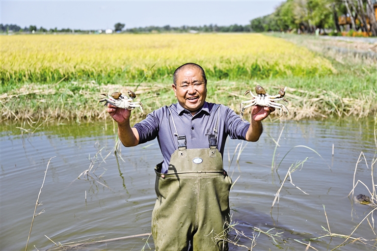 9月9日,工作人员在准格尔旗大路镇小滩子村黄河稻渔生态观光园展示抓到的螃蟹。内蒙古鄂尔多斯市准格尔旗大路镇小滩子村沿黄河分布有大面积的盐碱地。近年来,当地积极开展盐碱地综合治理工作,在盐碱地上种植耐盐碱水稻,发展水产养殖,将曾经的盐碱地打造成集农业生产、旅游观光等为一体的黄河稻渔生态观光园,实现土壤改良的同时助力乡村产业振兴。 摄影/新华社记者 李志鹏