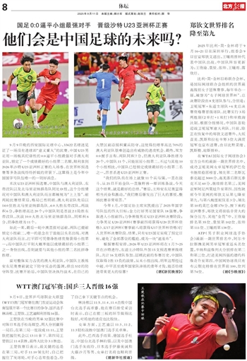 根据赛程安排,2026年U23亚洲杯将在1月7~25日在沙特进行,东道主沙特队外加15支预选赛晋级球队,共计16支球队参加。回顾此前的参赛历史,中国队仅取得2胜13负的战绩,从未小组出线。明年这帮经过中超、中甲甚至成年国家队淬炼的青年才俊,能否给球迷带来更大的惊喜?(据《新民晚报》)