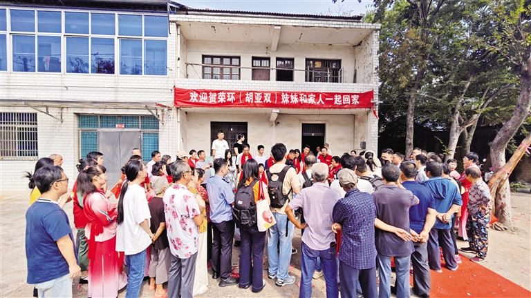家门口,亲人们点燃鞭炮和烟花,用朴实又热烈的方式,迎接骨肉至亲。9时56分,贺荣环见到了兄弟姐妹们。大哥胡仲兴为妹妹系上一条红围巾,贺荣环则一头扎进大哥的怀里,哽咽着说:“大哥,这么多年,终于见到你了!”