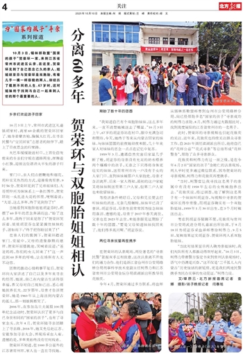 分离60多年 贺荣环与双胞胎姐姐相认