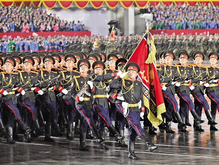 10月10日,方队在庆祝朝鲜劳动党成立80周年阅兵式上受阅行进。庆祝朝鲜劳动党成立80周年阅兵式当日在平壤金日成广场隆重举行,朝鲜劳动党总书记、国务委员长金正恩出席并发表讲话。据朝中社报道,朝鲜武装力量各军种和兵种组成的徒步方队及尖端装备方队陆续受阅。新型“火星炮-20”型洲际弹道导弹现身阅兵式。摄影/新华社记者 申 宏