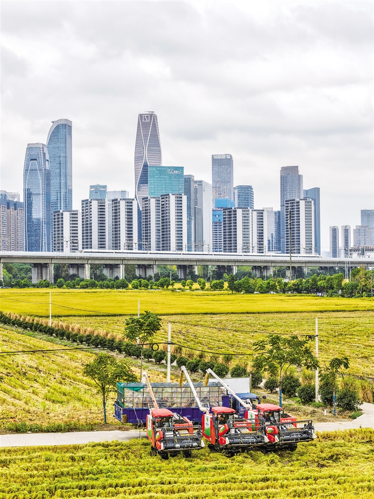 10月21日,收割机把收获的稻谷装车。金秋时节,位于浙江杭州萧山区世纪田园粮食功能区的3000多亩水稻迎来丰收,金黄的稻田、飞驰而过的高铁列车和远处的城市天际线构成了独特的城市田园画卷。