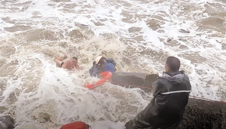每当王玉平和落水者就要靠近岸边时,又会被巨浪冲开,直到8时10分左右,两人终于被成功拉上岸。上岸后,落水者激动地跪地感谢,“他(王玉平)要是真的出事,我良心上过意不去,谢谢大哥舍命救我”。此时,王玉平除了额头的伤口外,身上还有多处擦伤,他确认落水者无碍后才在众人的搀扶下前往医院处理伤口。