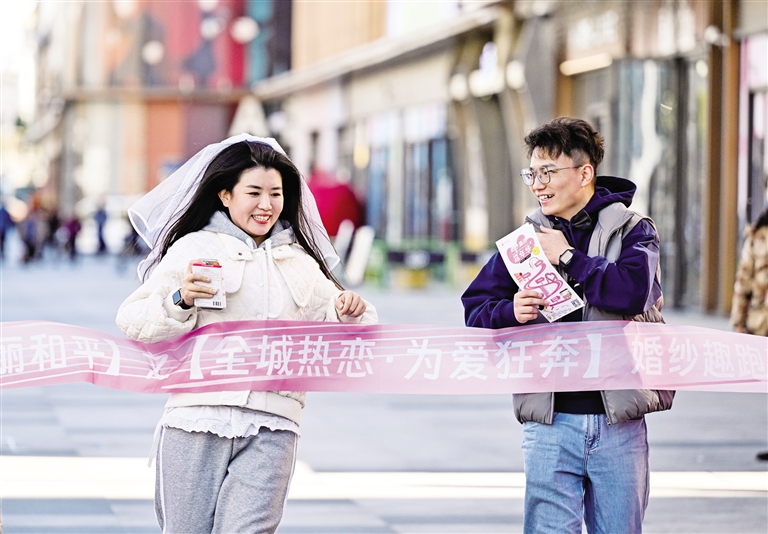11月2日,参加活动的一对情侣冲过终点。当日,由天津市和平区民政局主办的“悦动津城·美丽和平”之“全城热恋·为爱狂奔”婚纱趣跑嘉年华在和平区金街步行街举行,吸引了数十对情侣参加。摄影/新华社记者 赵子硕