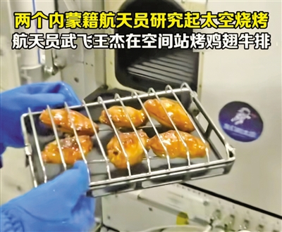 记者从空间站下行的视频资料看到,航天员从包装袋里取出腌制好的鸡翅,在签架上进行固定后放入热风烘烤机内,加热28分钟,一盘滋滋冒油的宇宙级奥尔良烤鸡翅就制作出来了。神二十航天员王杰和神二十一航天员武飞两个内蒙古人,还联手烤制了一盘热气腾腾的黑椒牛排,让神二十乘组指令长陈冬赞不绝口。