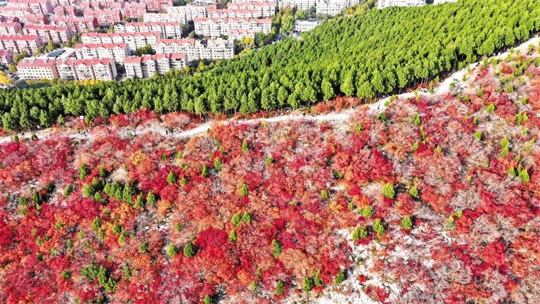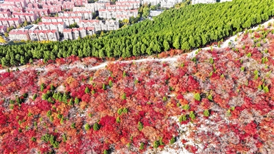 11月3日拍摄的济南蝎子山“平分秋色”景观。眼下,山东济南蝎子山迎来了一年中最美时刻。蝎子山以山脊为界,北山坡栽种松柏,南山坡种植黄栌,空中俯瞰,半山苍翠半山红,形成“平分秋色”的美丽景观。摄影/新华社记者 郭绪雷