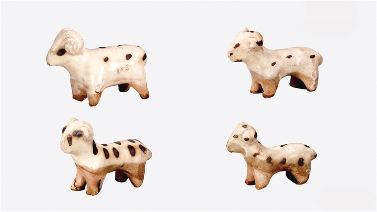 当看见这几只萌物时,你是舍不得下筷子的。这群小瓷羊出土于山西大同上皇庄遗址,堪称辽代“萌系文物”担当,大小和今天的盲盒手办差不多。如果你不小心把它们误认成小狗,那一定是忽略了其独特的灵魂——羊角。犄角盘成了圆圈状,四肢呈站立状,仔细看胖胖的小短腿,肥肥的尾巴,脚尖微微向前弯曲,细节直接拉满好感。