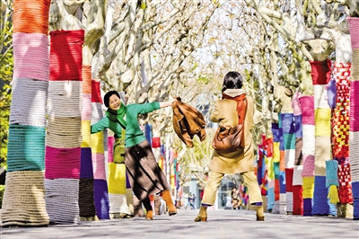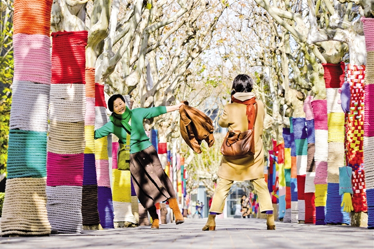 11月29日,市民在披着彩色“针织外衣”的行道树间拍照。近日,在北京街头,多处行道树披上色彩鲜艳的“针织外衣”,成为冬日里的靓丽街景。 摄影/新华社记者 谢 晗