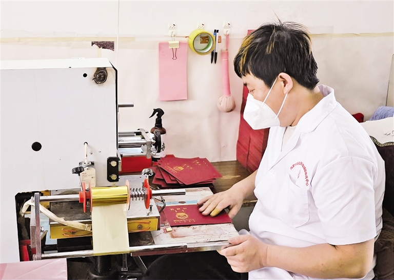 烫金、糊裱、裁切,残疾人员工在流水线上默契配合,他们用双手细细打磨每一处细节,将责任与温情注入方寸之间。