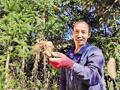 11月4日上午,56岁的徐义仲和妻子万松支又上山了,这一天他们挖到一筐野生黄精。徐义仲拿起一颗粗壮的黄精告诉我们:“这一颗7年的黄精,是功效很好的药材。”