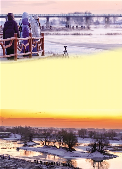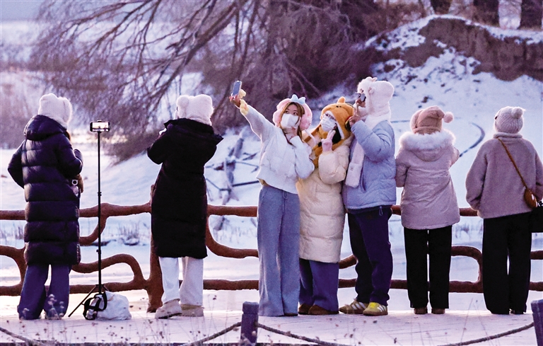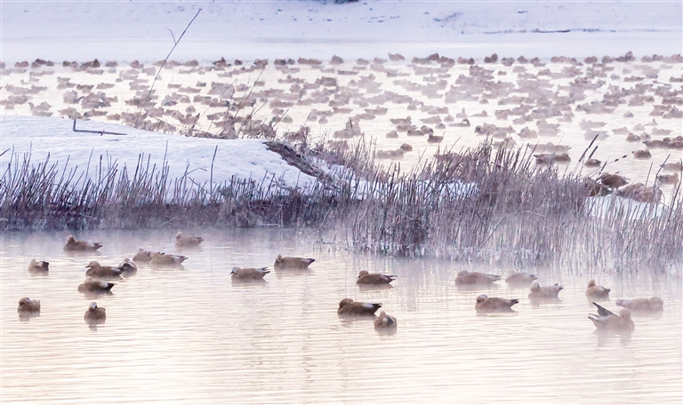 雪覆千岛玉纱轻,金霞破晓映湖明。12月24日,呼和浩特市玉泉区大黑河郊野公园“千岛湖”风景区银装素裹,湖区被皑皑白雪覆盖。清晨,一轮朝阳自天边缓缓升腾,金色霞光洒向湖面,光影流转间,天地一派清透空灵。在湖畔栈道上,赏景的市民游客纷纷举起手机、相机记录这难得的美景,赞叹声不绝于耳。湖中,同样生机盎然,成群的赤麻鸭在未结冰的水域嬉戏游弋,黑天鹅优雅划过水面,与白雪、红日构成一幅幅生动的生态画卷。
