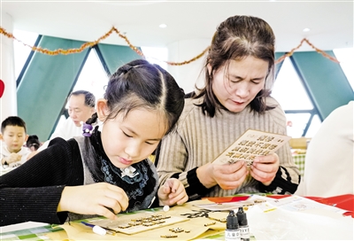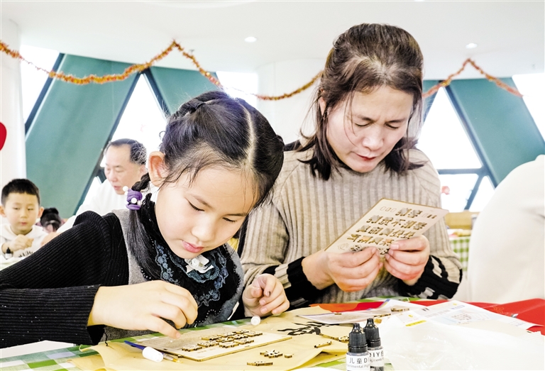 科普环节,讲师生动讲解立春作为节气之首的物候特征、本地习俗及科学内涵。实践体验中,孩子们在讲师指导下,与家长一起动手,亲身经历从拣字、排版到刷墨、拓印的活字印刷完整流程,并将亲手印刷出的“春”字与诗词作品定格为独特的新春纪念。