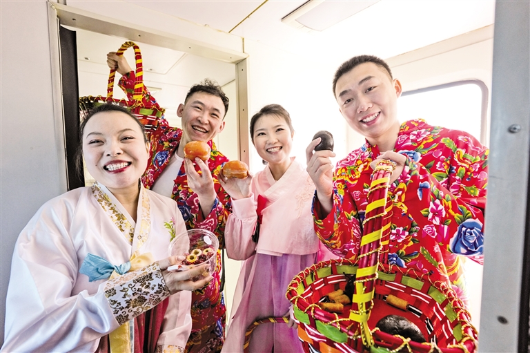 2月4日,在K7103次“列车大集”车厢内,身穿民俗服饰的乘务人员在展示冻柿子、冻梨和冻山楂。当日,黑龙江2026年首趟“列车大集”K7103次由哈尔滨始发,开往加格达奇。列车上设置专属展区,涵盖黑龙江省特色农产品以及铁路文创、“非遗”手工艺品等,旅客可现场品尝体验、扫码下单,实现车上体验、快递到家的便捷购物方式。摄影/新华社记者 王 松