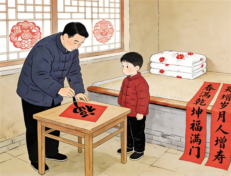 又近除夕,满街的春联红红火火。可在我心里,再精美的印刷品也抵不过父亲手写的那一副。那带着温度的墨香,那倾注美好的祈愿,仿佛将时光拉回到故乡老屋的冬夜。父亲写得一手令人称羡的毛笔字,街坊邻里总来请父亲写春联。最忙的自然是年关。腊月一过,家里便弥漫起年事的气氛,而父亲的“主场”也拉开了序幕。