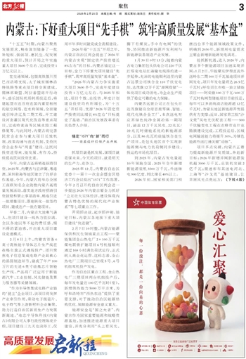 项目多点突破,内蒙古正着力提高新能源开发质效,奔赴新目标:2026年新增并网新能源装机超3000万千瓦,总装机突破2亿千瓦;提速库布其送电河北、上海等“沙戈荒”基地建设,让草原风光点亮远方;(下转4版)