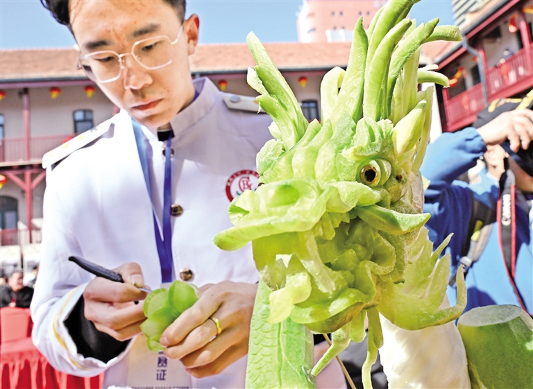 2月25日,一名参赛选手在雕刻作品。当日,以“非遗焕彩贺新春”为主题的2026年青岛萝卜雕刻大赛在青岛市市北区广兴里举行,来自当地餐饮行业的30多名食品雕刻技师同台竞技,集中展示食品雕刻技艺。