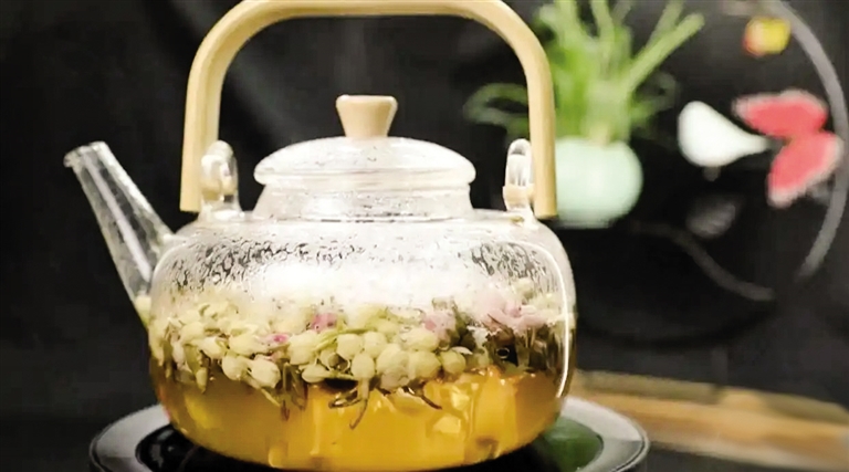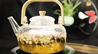 制作方法:玫瑰花、茉莉花各取10克,大火煮开后,再煎煮15分钟,常温放置温度适中后即可饮用。