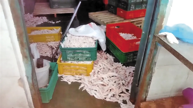 在鸡爪产品前期加工现场,食品加工车间里泡制区、修剪区、挑选区臭气弥漫,刺鼻的腥臭味让人作呕,生产环境脏乱不堪:地面长期淤积着浑浊污水,各类塑料筐杂乱无章随意堆放,生产机械设备表面污渍厚重、油污遍布。在这个车间里,大量鸡爪直接裸露堆放在潮湿肮脏的地面上,扫帚、铁锹等清洁工具随意压放在鸡爪上;即便鸡爪被人员踩踏,工人也只是随手捡起,直接放回加工筐中继续使用,完全无视食品卫生安全。即便环境脏乱,最终出炉的鸡爪却个个白净诱人,因为工厂进行了一道关键的“漂白”工序。工作人员坦白:“它是双氧水漂白的。”