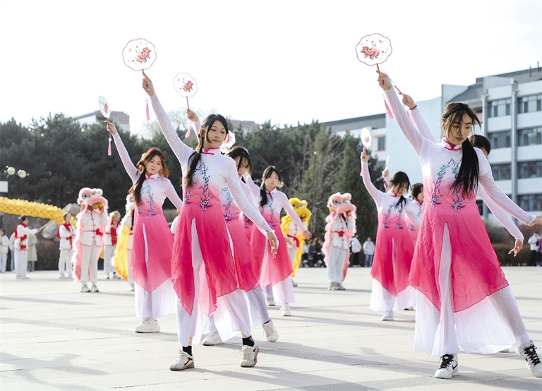 3月20日,为深入传承中华优秀传统文化,内蒙古鸿德文理学院举办“龙抬头 共同心”主题民俗活动,花车巡游、踩高跷、扭秧歌、舞龙舞狮、安代舞、腰鼓等特色节目轮番上演,校园内处处洋溢着喜庆祥和的节日氛围。摄影/草原云·北方新报首席记者 牛天甲