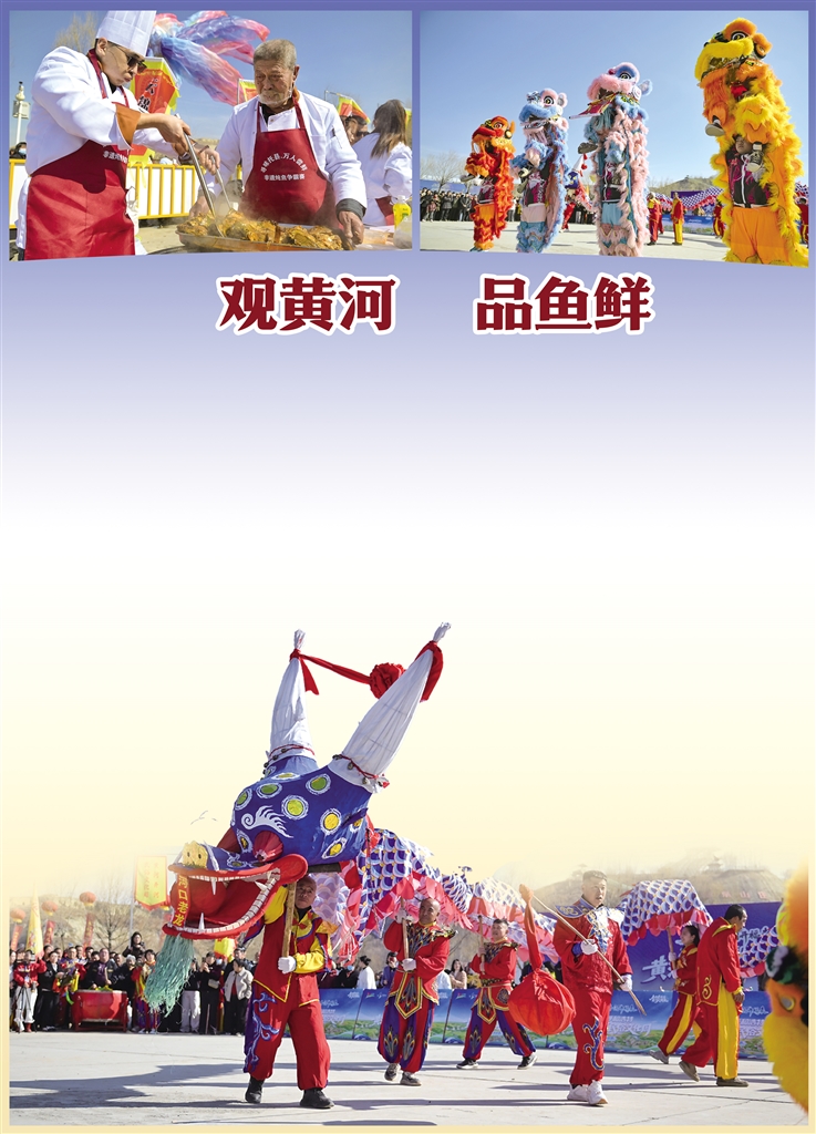 当日9时30分,锣鼓喧天,巨龙翻腾、雄狮跃舞,“龙狮呈祥”表演点燃现场;鱼灯舞、鳌鱼巡游依次亮相,游客纷纷驻足拍照。10时许,百面大鼓齐鸣,老渔民擂响“开河锣”,高喊:“开河了!”漫天锣鼓齐鸣,2026呼和浩特黄河开河民俗文化周正式开启。开幕式演出涵盖戏歌、二人台联唱等,春晚节目《奔腾的海骝马》再现引发欢呼。