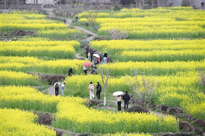 近年来,幸福村以春季油菜花田为特色名片,打造“赏花经济”,不仅带火了乡村旅游,更带动本地农特产品热销,民宿入住率显著提升,为乡村振兴注入活力。 摄影/新华社记者 张 端