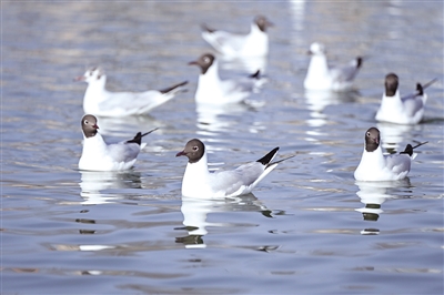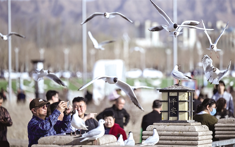 近日,随着天气转暖,大批红嘴鸥来到乌海市乌海湖觅食嬉戏,与沙漠、湖泊、城市构成了独特的春日景观,吸引众多游人到湖边打卡观景。 摄影/新华社记者 连 振