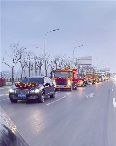 3月28日,上班开粪车、下班开奔驰的浙江小伙潘浩男结婚了。由吸粪车组成的婚车车队让人眼前一亮。