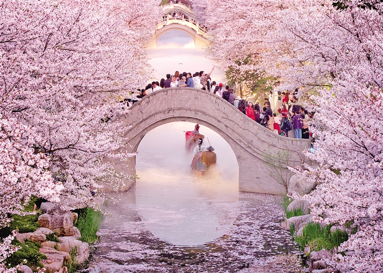 4月5日,游客在江苏南通洲际梦幻岛欣赏樱花河。清明假期,人们度假休闲,踏青游玩,释放“春日经济”新活力。 (据新华社报道)