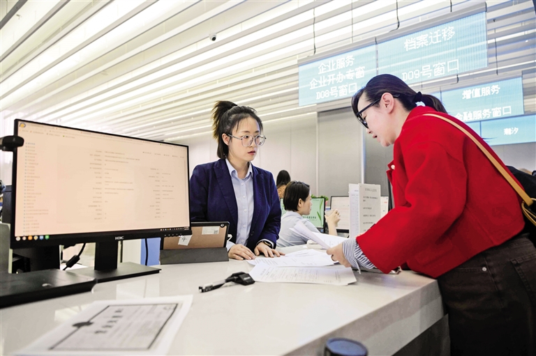 4月8日,在新城区政务服务中心企业服务专区,工作人员为企业代表办理相关业务。据了解,为持续优化营商环境,不断提升服务水平,呼和浩特市新城区推进“高效办成一件事”集成改革,整合政务服务资源,提升政务服务效率。摄影/草原云·北方新报首席记者 牛天甲