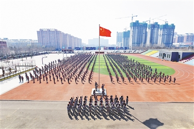 ②新城第一小学举行升国旗仪式。