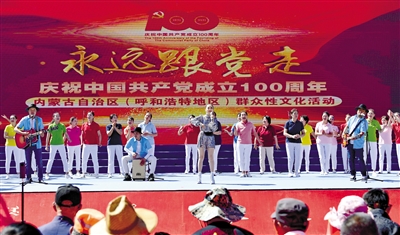 “永远跟党走”——庆祝中国共产党成立100周年内蒙古自治区群众性文化活动在各地广泛深入开展,将贯穿全年,持续不断。呼和浩特地区除合唱展演外,还有“党史学习教育‘送文化’进校园”演出、“百年百首”诗歌朗诵会、广场舞展演、书法摄影展、电影展播、专业文艺院团惠民演出等,为广大群众提供文化大餐,不断掀起群众文化活动高潮,充分体现“热在基层、热在群众”。