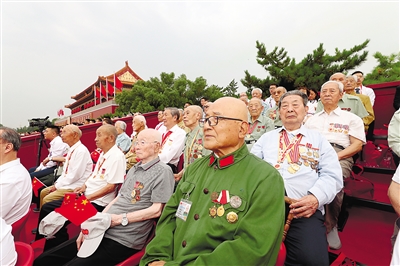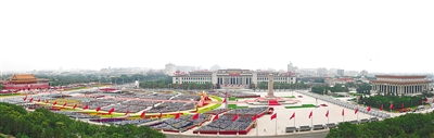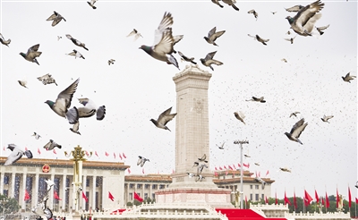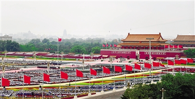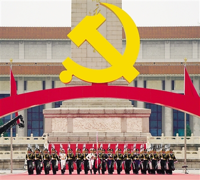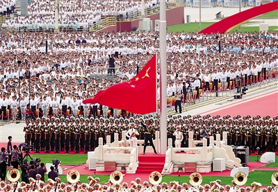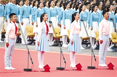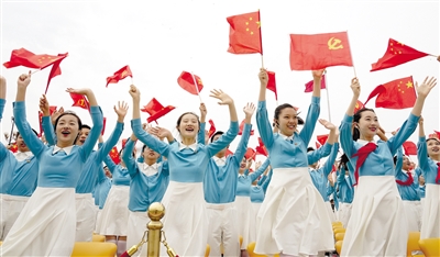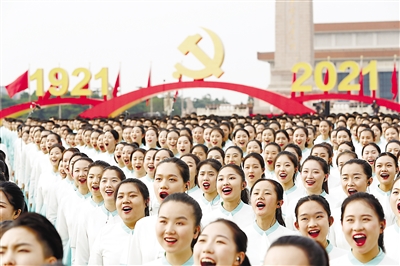 节日的首都北京花团锦簇、旌旗飘扬。天安门广场东西两侧,100面红旗迎风招展。从空中俯瞰,天安门广场“巨轮启航”造型宏伟壮观,正乘风破浪、扬帆奋进,驶向中华民族伟大复兴的光辉未来。人们在广场上组成巨大方阵,全场高唱昂扬奋进的经典歌曲,抒发对党的热爱和祝福。 雄鹰翱翔,振翅长空。中国人民解放军71架战机飞向天安门广场,向党致敬,向祖国致敬,向人民致敬。100响礼炮响彻云霄,全场齐声高唱中华人民共和国国歌,鲜艳夺目的五星红旗冉冉升起,在天安门广场上空迎风飘扬。共青团员和少先队员代表集体致献词,向党致以青春的礼赞,抒发“请党放心、强国有我”的铮铮誓言。