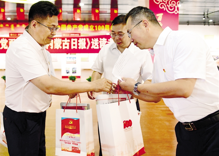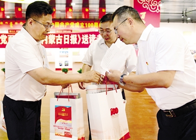 内蒙古大学民族博物馆3楼,庆祝中国共产党成立100周年内蒙古大学师生书画摄影作品展开展仪式正在进行,我们的赠报活动也在此举行。内蒙古日报社党委书记、社长吴海龙向内蒙古大学党委书记刘志彧赠送了《内蒙古日报》百版特刊。内蒙古日报社党委委员、副总编辑白春寄语学生,将人生理想融入人民幸福、民族振兴、国家富强的伟业中。